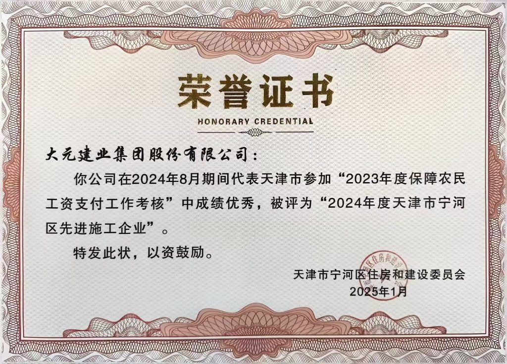 11月20日,大元集团京津工程局承建的天津宁河安置房项目,凭借严格的实名制管理和完善的农民工工资保障体系,在国务院对省级根治欠薪工作整体情况的检查中表现出色,荣获“标杆项目”称号。为表彰大元集团在迎检工作中的突出表现,天津市宁河区人力资源和社会保障局向集团发出感谢信,宁河区住房和建设委员会授予集团“2024年度天津市宁河区先进施工企业”荣誉称号。